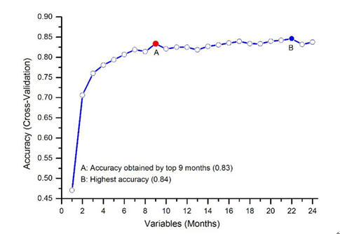 為分析基于物候曲線進行紅樹林植物群落分類的原理,研究人員對物候生長曲線的各個節(jié)點進行了特征貢獻率定量研究,發(fā)現(xiàn)每年的冬末春初遙感圖像是區(qū)分不同植物群落的最佳影像。交叉驗證的結(jié)果顯示,僅用1-4月份的NDVI值就可將研究區(qū)內(nèi)的紅樹林植物群落分類精度提高至83%,如圖3所示。在漳江口保護區(qū)內(nèi),基于物候特征和隨機森林分類算法的紅樹林植物群落分類雖然取得了較好的精度,但是這種方法應(yīng)用于群落更為復雜的區(qū)域,例如,海南清瀾港(紅樹林群落類型20余種),仍有一些列不確定性,需要進一步研究和驗證。