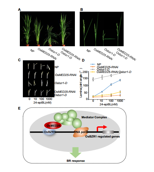 近日,中國科學院東北地理與農(nóng)業(yè)生態(tài)研究所卜慶云研究員團隊在Journal of Integrative Plant Biology在線發(fā)表了題為“Oryza sativa Mediator Subunit OsMED25 Interacts with OsBZR1 to Regulate Brassinosteroid Signaling and Plant Architecture in Rice ” 的研究論文。該研究通過遺傳學、分子生物學及生物化學等手段闡明了水稻中介體亞基OsMED25參與油菜素內(nèi)酯BRs信號,進而調(diào)控水稻株型的分子機制。