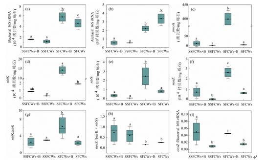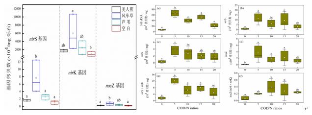 在人工濕地溫室氣體協同減排方面,發現生物炭添加對不同溫室氣體排放的影響存在明顯差異,沒有影響CO2排放,但顯著促進了CH4的排放、顯著減少了N2O排放,并使潛流人工濕地的GWP降低了57.3%。這一發現有助于客觀評價生物炭調控過程中對不同類型溫室氣體排放的正負效應。基于q-PCR分析,發現添加生物炭的人工濕地中nosZ基因轉錄和nosZ /(nirS + nirK)比值均有所增加(圖3),進而驅動了N2O排放通量的降低。研究還發現,生物炭強化可同步提升人工濕地對COD、NO3--N和TN的去除效率,實現水質凈化與溫室氣體減排的協同。這一成果將為優化人工濕地設計、提升其綜合生態環境效益提供重要的科學支撐。
