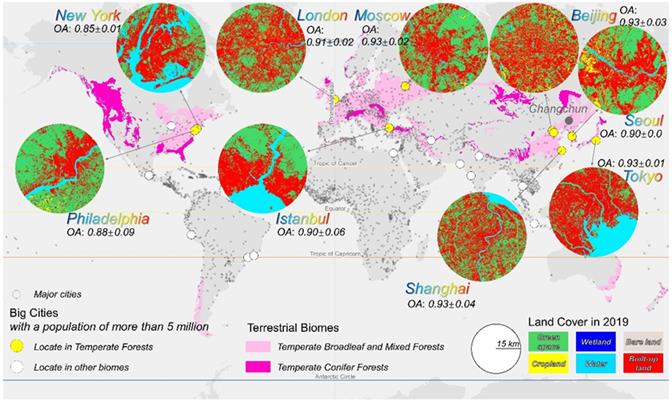 圖2. 2019年15m分辨率世界主要城市景觀覆被