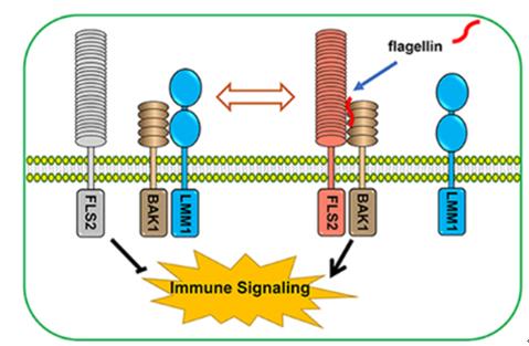 無病原菌侵入時,GmLMM1與病原體模式識別受體BAK1結合,免疫反應被抑制;當病原菌(flagellin)侵入植物細胞后,可以誘導病原菌特異模式識別受體FLS2和BAK1結合,以觸發(fā)下游免疫信號。 GmLMM1在免疫激活過程中可以調節(jié)FLS2-BAK1相互作用,從而控制適度的免疫激活。