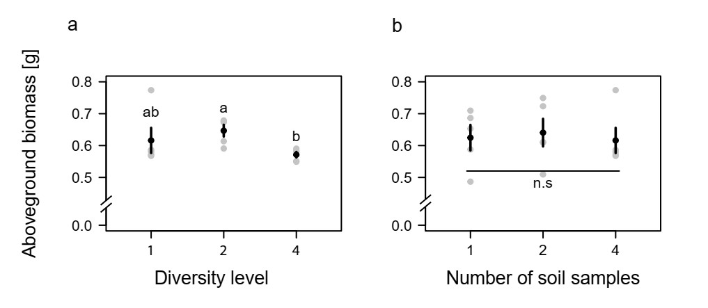 針對以上研究缺口,中科院東北地理與農業生態研究所生物入侵生態學研究團隊與德國康斯坦茨大學生態學研究團隊借鑒植物-土壤反饋的研究方法,利用溫室控制實驗,探究了本地植物多樣性如何通過土壤微生物調控外來植物的入侵過程。實驗第一階段,研究人員利用不同的本地植物物種馴化土壤微生物群落,并測定了不同植物馴化后的土壤微生物群落多樣性。實驗第二階段,研究人員將來自不同植物馴化過的土壤人工混合,組成不同的植物多樣性梯度的馴化土壤(分別是多樣性1、2和4),然后在這些土壤里種植外來植物,并測定其生長表現。