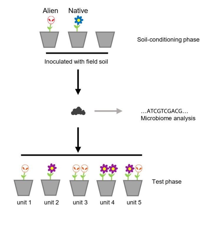 研究人員利用植物-土壤反饋的研究手段(圖1),在第一階段,選擇了4種外來植物和6種本地植物分別對土壤進行了馴化(即隨著植物的生長,它會改變土壤微生物的構成),并設置了一個沒有植物的對照。植物生長15周后,研究人員收獲了土壤,并采樣進行擴增子測序得到土壤細菌和真菌的群落結構。在第二階段,研究人員將新一批植物(5種外來植物和5種本地植物)種在了收獲的土壤,共設置了5個競爭處理:外來/本地種的單種,外來/本地種的單物種種群,以及外來本地種的混種群落。
