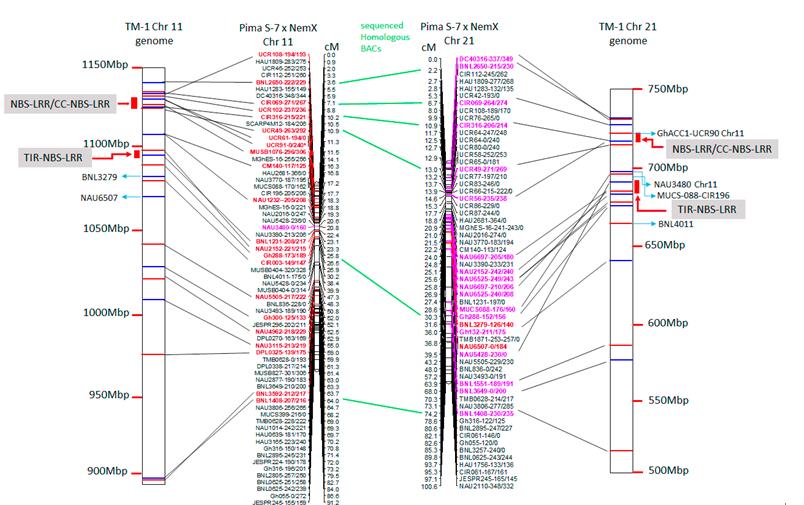 圖1:棉花TM1物理圖譜和RIL(PimaS-7xNemX)群體形成的遺傳圖譜比對(duì)。紅色的SSR分子標(biāo)記表示被定位到TM1-Chr11,粉色的SSR表示被定位到TM1-Chr21。