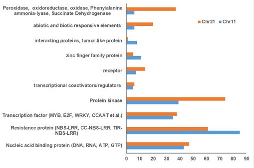 圖2:基于棉花Unigene數(shù)據(jù)庫(kù)對(duì)Chr11抗性基因簇和Chr21染色體的同源區(qū)域的應(yīng)激反應(yīng)元件(stress response elements)的比較