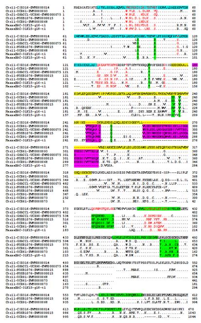 圖3:Chr11抗性基因蛋白(CC)-NBS-LRR 與Chr21和感病品種中的同源抗性蛋白比較 (首行藍(lán)色代表CC結(jié)構(gòu)域,黃色代表NB-ARC結(jié)構(gòu)域,綠色和灰色代表LRR結(jié)構(gòu)域)