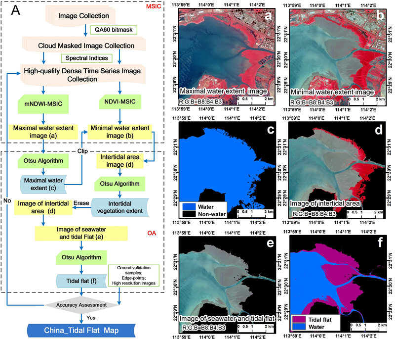 圖1. 基于Sentinel-2密集時(shí)間序列影像的MSIC-OA灘涂制圖流程(A),及每步的結(jié)果(a-f)。
