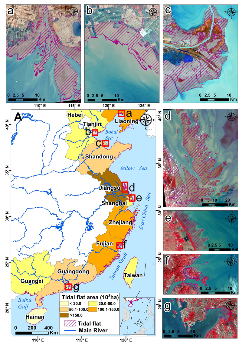 圖2. 中國(guó)濱海灘涂空間分布及沿海各省份灘涂面積。