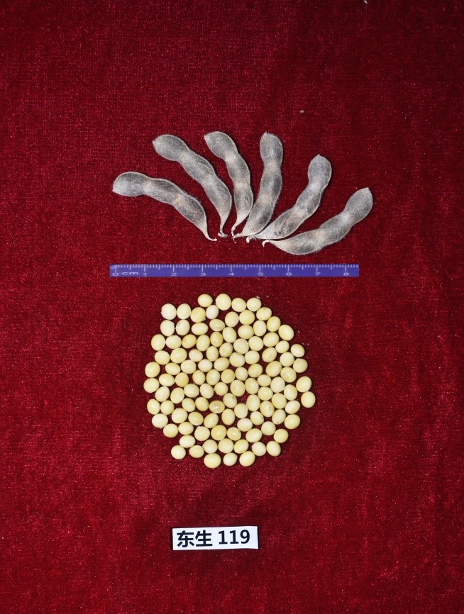 “東生119” (審定編號:吉審豆20210029)為高產大豆新品種。該品種以吉育47為父本,黑農51為母本。2019-2020年區域試驗平均公頃產量3009.3公斤,比對照吉育86增產8.1%;2020年生產試驗平均公頃產量2953.1公斤,比對照吉育86增產5.4%。亞有限結莢習性,平均株高88.1厘米,主莖型結莢,主莖節數17.7個,以三粒莢為主,莢熟時呈深褐色。圓葉、白花、灰毛,籽粒圓形,種皮黃色,有光澤,種臍黃色,平均百粒重21.6克。人工接種鑒定,高抗大豆花葉病毒1號株系,高抗大豆花葉病毒3號株系。兩年平均籽粒粗蛋白質含量38.14%,粗脂肪含量21.24%。