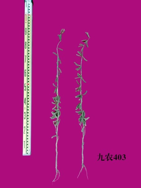 “九農403” (審定編號:吉審豆20210027)為高產大豆新品種。該品種以合豐51為父本,九農33為母本。2019年區域試驗平均公頃產量3137.40公斤,比對照吉育86增產15.04%;2020年區域試驗平均公頃產量3194.82公斤,比對照吉育86增產13.20%,二年區域試驗平均公頃產量3166.11公斤,比對照吉育86增產14.12%;2020年生產試驗平均公頃產量3171.79公斤,比對照吉育86增產12.18%。亞有限結莢習性,平均株高81.7厘米,主莖節數17.8個,有效分枝2.2個,三粒莢多,莢熟時呈褐色。尖葉、紫花、灰毛,籽粒圓形,種皮黃色,有光澤,種臍黃色,平均百粒重20.0克。人工接種鑒定,高抗大豆花葉病毒1號株系,高抗大豆花葉病毒3號株系。籽粒粗蛋白質含量38.81%,粗脂肪含量21.26%。
