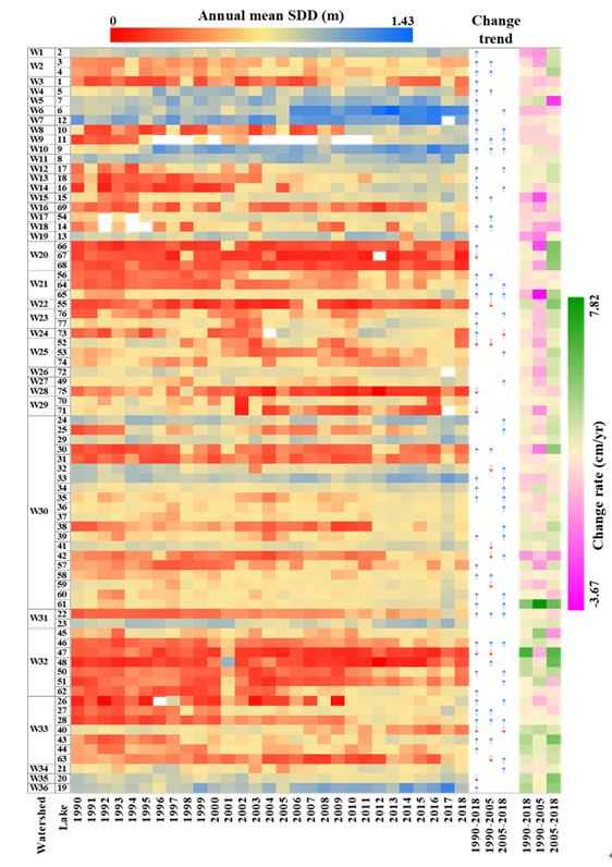 透明度,作為一種最直觀地反映水體光學特性的指標之一,常被用來監(jiān)測水體的質量狀況。該指標能夠揭示水體的透明程度和渾濁度,也能夠綜合地反映水體生態(tài)系統(tǒng)的營養(yǎng)狀態(tài)。遙感技術手段的出現(xiàn),使得大范圍監(jiān)測湖庫透明度變化成為可能。遙感反演透明度的算法主要包括三種:分析算法,半分析算法和經驗算法。其中經驗算法被廣泛地用來反演不同區(qū)域尺度透明度變化。以往研究學者對松花江流域透明度的遙感監(jiān)測時段主要集中在2000年以后,且側重透明度反演算法的研究。因此,中國科學院東北地理與農業(yè)生態(tài)研究所水環(huán)境遙感學科組的科研人員們基于2004-2017年實測湖庫透明度數據和GEE云計算平臺,運用經驗算法開展了遙感反演松花江流域77個湖泊透明度的長時間序列(1990-2018年)動態(tài)變化研究。結果發(fā)現(xiàn),2005年以來松花江流域的湖庫水質得到改善。具體來說,2005-2018年松花江流域的年均透明度表現(xiàn)為上升的趨勢(p<0.05),從0.29米增加到0.37米。而且,從1990-2005到2005-2018,透明度表現(xiàn)為上升趨勢的湖泊個數由18個增加到31個(圖1)。通過影響因素貢獻率分析,發(fā)現(xiàn)用于農業(yè)生產的化肥對湖庫透明度年際變化的貢獻率最大,其次是廢水排放和植被覆蓋(NDVI)。進一步分析,得出松花江流域水質改善的原因主要包括兩方面,一是廢水排放的處理能力和數量有了很大提高,二是植被覆蓋有了很大改善。但是,農業(yè)的非點源污染對松花江流域的湖庫水質影響仍然存在,在將來仍然需要對湖庫的水質改善繼續(xù)做出努力。