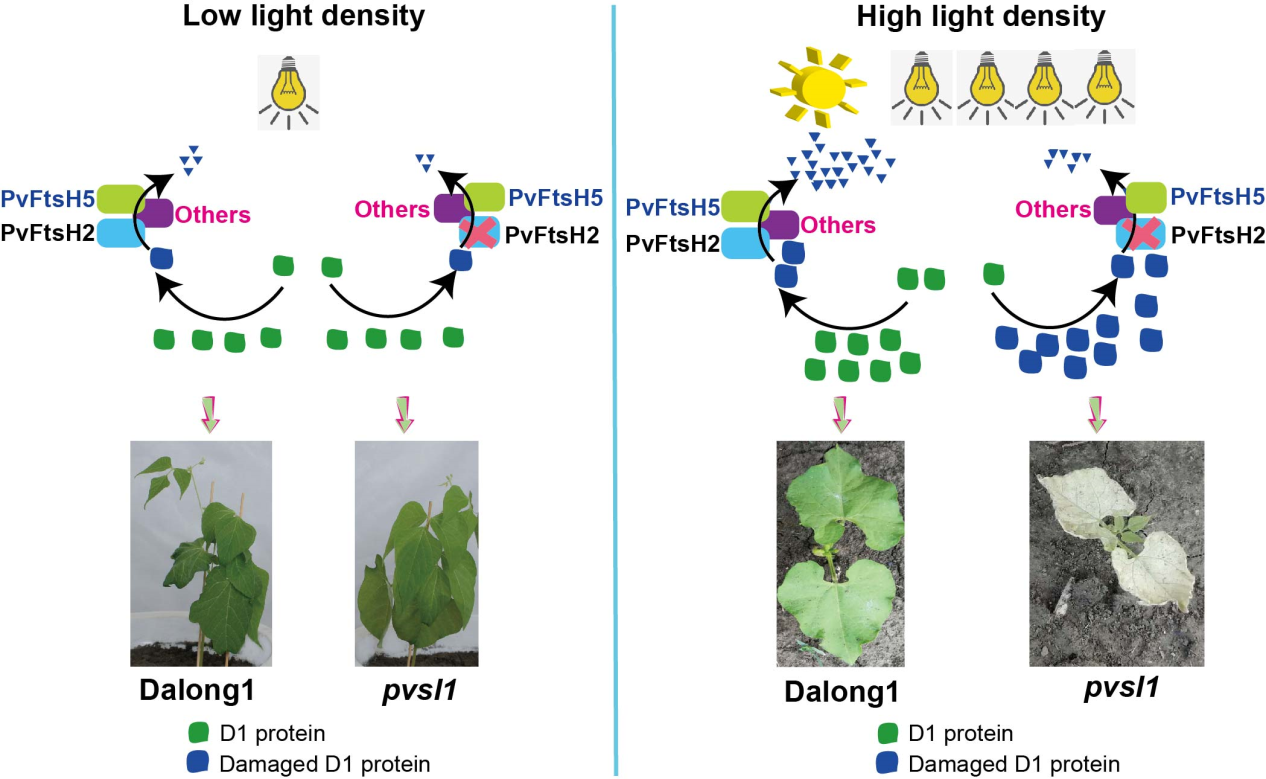 東北地理所夏正俊課題組在Horticulture Research上發(fā)表了題為A critical role of PvFtsH2 in the degradation of photodamaged D1 protein in common bean的研究論文。本研究以中國(guó)菜豆品種大龍1號(hào)為背景材料,在60Co輻射創(chuàng)制突變體材料中發(fā)現(xiàn)一幼苗致死的pvsl1突變體,該突變體出苗后在田間或高光強(qiáng)下2周內(nèi)死亡;在溫室中低光強(qiáng)下則表現(xiàn)為失綠表型,還可正常開(kāi)花結(jié)實(shí)。經(jīng)INDEL分子標(biāo)記將PvSL1候選基因定位在2號(hào)染色體53.7 kb區(qū)域內(nèi),候選基因Phvul.002G190900的CDS區(qū)域在pvsl1突變體中發(fā)生了1 bp的缺失,導(dǎo)致蛋白翻譯提前終止。Phvul.002G190900基因(PvFtsH2)的表達(dá)量隨光強(qiáng)增強(qiáng)而上調(diào),在pvsl1突變體中其表達(dá)量明顯下調(diào)。pvsl1突變體中PvFtsH2蛋白功能的喪失導(dǎo)致高光強(qiáng)下受損傷的D1蛋白不能被及時(shí)降解清除、造成PSⅡ的不可逆損害,使得光合作用能力下降、葉片細(xì)胞死亡,進(jìn)而引致植株整體死亡。在pvsl1突變體中PvFtsH5和PvFtsH8的表達(dá)量上調(diào),暗示其他FtsH家族成員亦具有部分補(bǔ)償PvFtsH2降解清除光損傷D1蛋白的能力,使得pvsl1突變體在低光強(qiáng)下能夠完成營(yíng)養(yǎng)生殖生長(zhǎng)。該研究結(jié)果揭示了PvFtsH2蛋白對(duì)確保菜豆光合系統(tǒng)在強(qiáng)光下正常運(yùn)轉(zhuǎn)發(fā)揮著重要的功能。