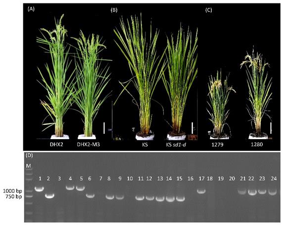 圖1 新創(chuàng)制的矮桿、半矮桿材料的表型和sd1-d等位基因的分子鑒定