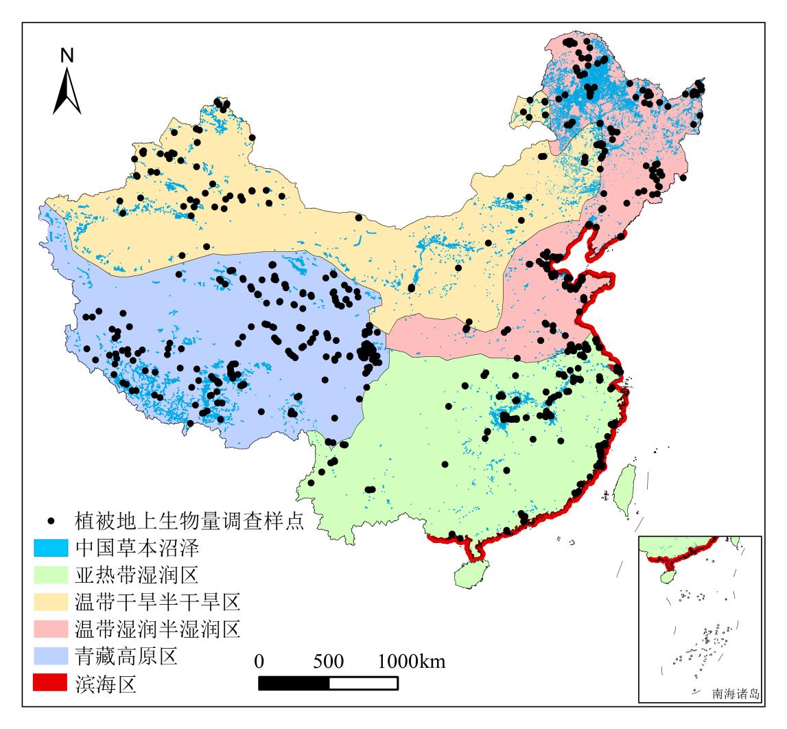 圖1 中國草本沼澤植被分布及其地上生物量調查樣點
