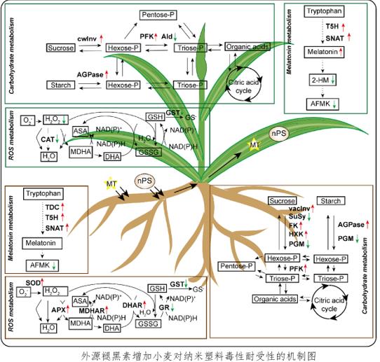 東北地理所作物生理與栽培學(xué)科組研究人員以小麥為研究對象,針對褪黑素影響聚苯乙烯納米微粒吸收、轉(zhuǎn)運及生理作用進行了研究。借助激光共聚焦和掃描電鏡觀察發(fā)現(xiàn),聚苯乙烯納米微粒可以被小麥根系吸收,并且當(dāng)小麥根系暴露于褪黑素和聚苯乙烯納米微粒的混合溶液中時,小麥葉片和根系中聚苯乙烯納米微粒的積累量減少。RT-qPCR分析表明,外源褪黑素能夠調(diào)節(jié)葉片中水通道蛋白相關(guān)基因TIP2-9、PIP2、PIP3和PIP1.2的表達以及根系中TIP2-9、PIP1-5、PIP2和PIP1.2的表達。針對褪黑素處理減少聚苯乙烯納米微粒對小麥影響的生理機制,研究人員從內(nèi)源褪黑素代謝、碳水化合物代謝、活性氧代謝等三個方面對暴露于聚苯乙烯納米微粒的小麥葉片和根系進行進一步的分析。結(jié)果表明,施加的外源褪黑素參與小麥植株對聚苯乙烯納米微粒的響應(yīng),但不依賴于內(nèi)源褪黑素代謝;同時,外源褪黑素施加還可以通過改變多種抗氧化酶活性(包括CAT、GST、APX、MDHAR、DHAR、GR和SOD)維持聚苯乙烯納米微粒造成的氧化脅迫下小麥的氧化還原穩(wěn)態(tài)平衡,并且通過改變碳水化合物代謝水平,保證小麥生長所需的物質(zhì)和能量供應(yīng),從而增強植株對聚苯乙烯納米微粒毒性的耐受性。