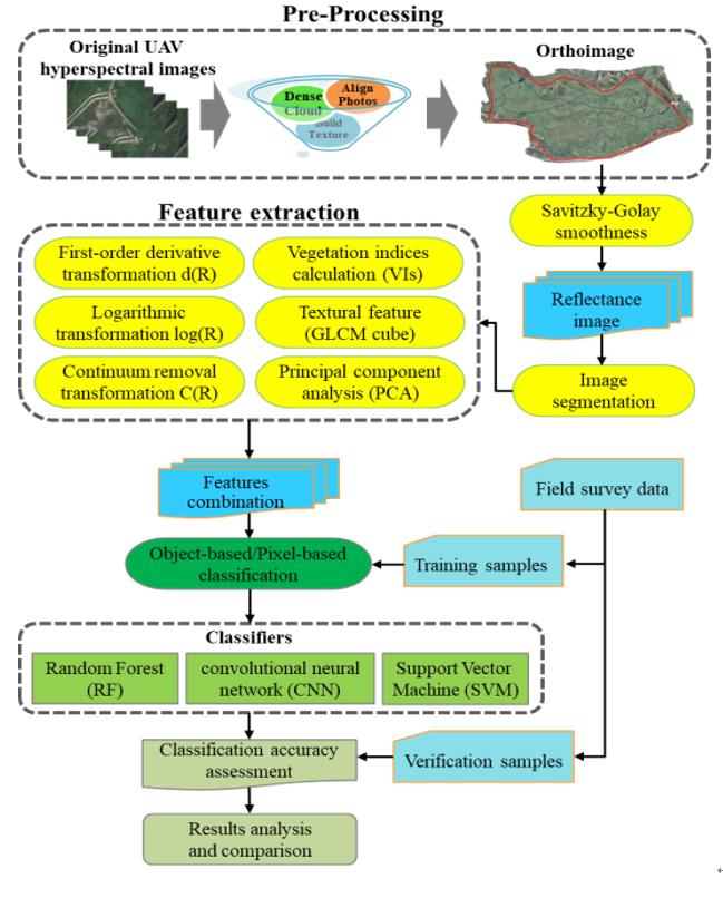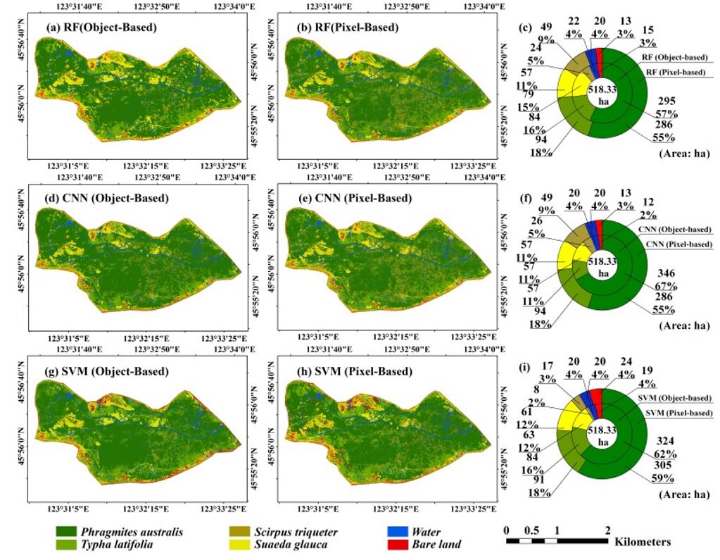 地理景觀遙感學科組研究人員利用無人機遙感的優(yōu)勢,集成高光譜成像和機器學習技術,實現(xiàn)了莫莫格核心區(qū)濕地植物群落的遙感分類制圖。通過對高光譜數(shù)據(jù)的多種變換構建最優(yōu)特征波段子集,對比了基于面向對象和像元的三種機器學習相結合的6種分類方法的精度,成功實現(xiàn)莫莫格濕地核心區(qū)的濕地植物群落分布的精細制圖。研究發(fā)現(xiàn):基于面向對象+隨機森林的方法得能夠更準確地刻畫濕地植物群落邊界,提取精度最高達87.75%;莫莫格核心區(qū)域的蘆葦群落和香蒲群落面積分別為295 ha(57%)和84 ha(16%)。