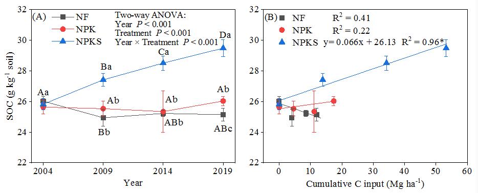 對于高強度利用的農(nóng)田生態(tài)系統(tǒng),秸稈還田被認為是提升土壤有機碳、改善土壤肥力的有效措施。基于全球數(shù)據(jù)的Meta分析表明,連續(xù)12年的秸稈還田后土壤有機碳將達到飽和狀態(tài),因此,要揭示連續(xù)秸稈還田條件下土壤有機碳的動態(tài)變化規(guī)律,需開展長期的田間動態(tài)觀測。