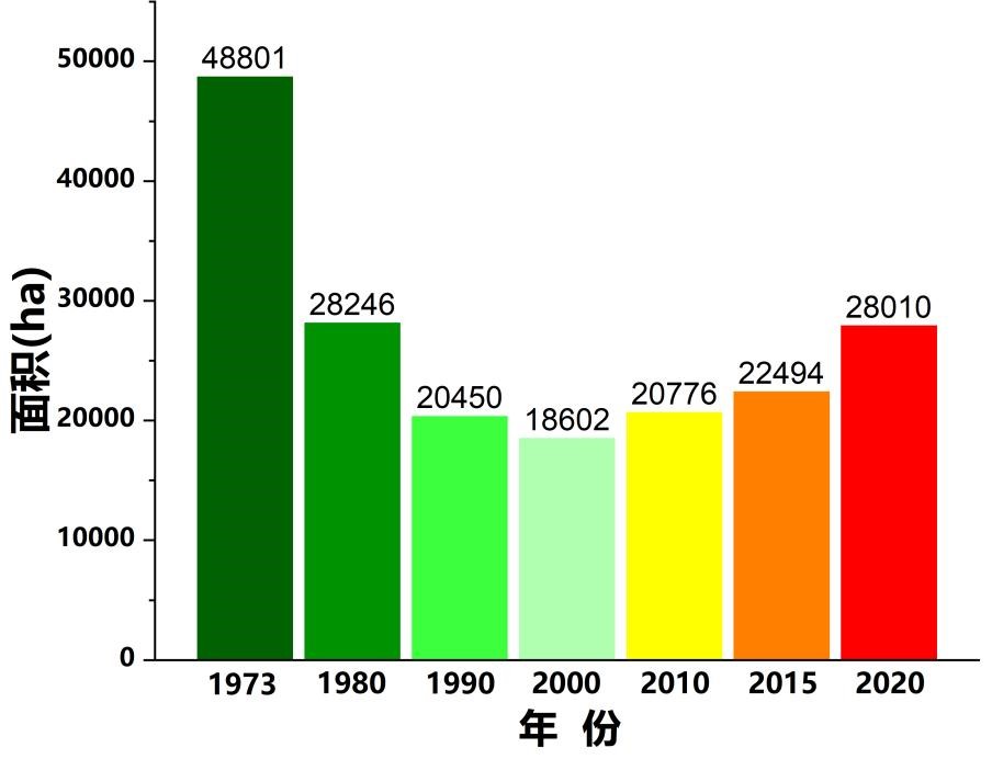研究表明,近50年中國紅樹林面積先減少后增加,如圖2所示。其中1973-2000年中國紅樹林減少了30199 ha,約62%的紅樹林消失;2000-2020年紅樹林面積增加9408 ha,增長51%。2020年中國紅樹林的總面積基本恢復(fù)到1980年水平。