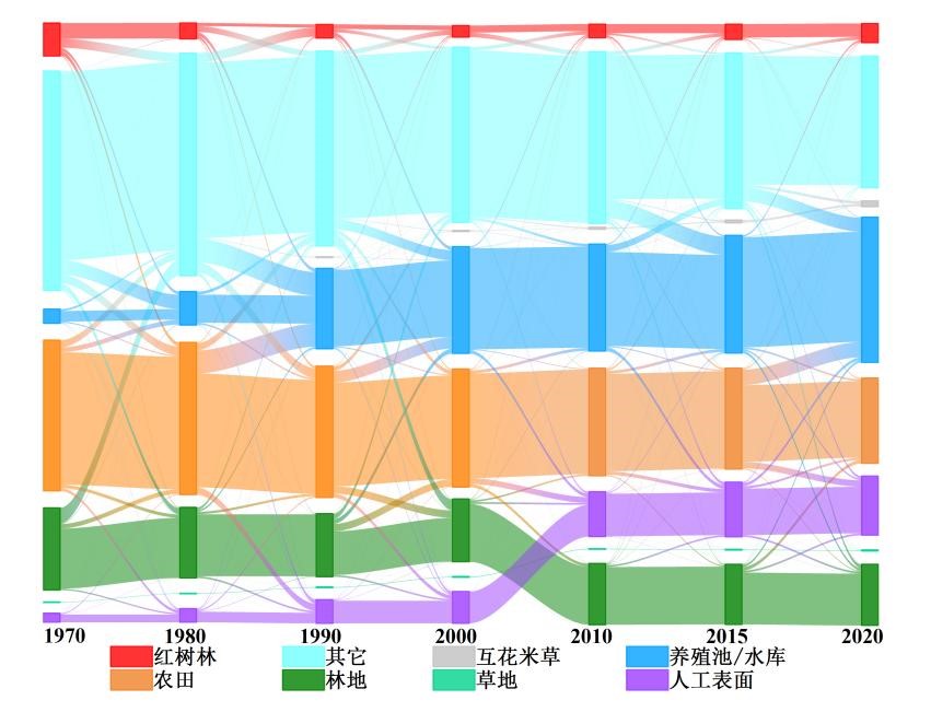 圖3. 1973-2020年紅樹林生長區(qū)土地覆蓋類型相互轉(zhuǎn)化