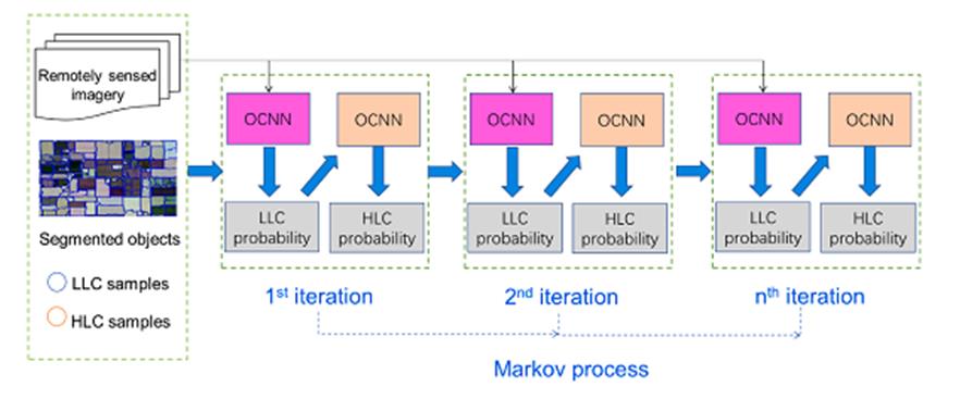 東北地理所地理信息系統(tǒng)學科組研究人員,針對高分影像復雜農(nóng)業(yè)區(qū)作物種植結(jié)構(gòu)信息提取難題,提出了一種新穎的迭代深度學習方法(Iterative Deep Learning (IDL)),在國際上首次發(fā)現(xiàn)并利用不同作物層次之間相關(guān)關(guān)系提高農(nóng)作物遙感分類精度。IDL將作物按層級劃分為高層次作物(HLC,例如糧食作物、蔬菜作物等)和低層次作物(LLC,例如玉米、大豆等),并將HLC和LLC的分類結(jié)果納入統(tǒng)一的深度學習遙感分類框架。LLC作為HLC分類的條件概率,而HLC聯(lián)合遙感影像作為LLC分類的條件概率,如此迭代策略構(gòu)成馬爾科夫鏈,使得LLC和HLC分類在迭代過程中協(xié)同進化、彼此修正,最終實現(xiàn)了LLC和HLC分類精度的共同提高。