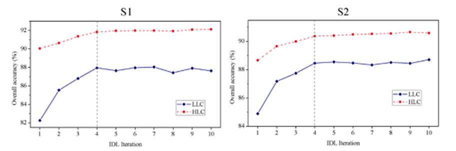 圖2. 迭代深度學習中LLC和HLC分類精度隨模型迭代次數(shù)增加的變化圖