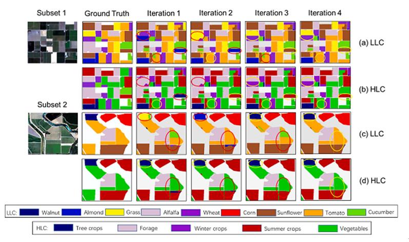 研究人員使用UAVSAR(S1)和Rapideye(S2)兩種高分遙感影像對研發(fā)的IDL有效性進行了驗證。研究結(jié)果表明,迭代深度學習IDL方法可同時提高LLC和HLC分類精度,且算法效率極高,僅用四次迭代LLC和HLC同時達到了最高精度。DIL生產(chǎn)的LLC和HLC分類精度比面向?qū)ο蠓诸惙椒ǖ葍?yōu)秀方法分別高4-7%和2-5%。本研究為復雜地區(qū)農(nóng)作物種植結(jié)構(gòu)信息的智能提取提供了全新的解決思路。