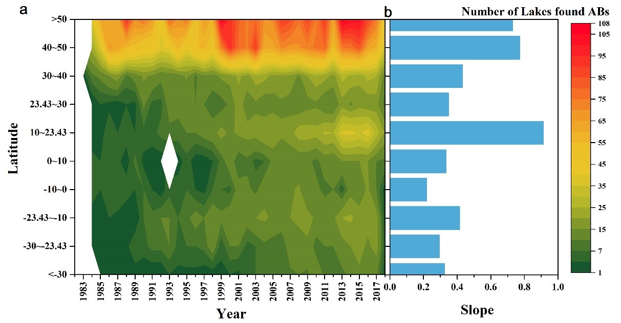 圖1 1982年–2018年間全球不同緯度地區(qū)湖泊藻華暴發(fā)情況;(a)暴發(fā)藻華的湖泊數(shù)量(b)藻華暴發(fā)情況隨時(shí)間變化的線性回歸斜率系數(shù)(p <0.05)