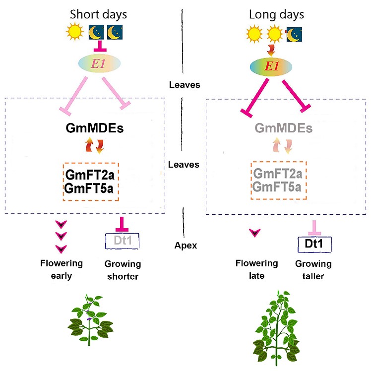 圖1. E1-GmMDEs-GmFT2a/5a-Dt1響應(yīng)光周期的分子模式圖