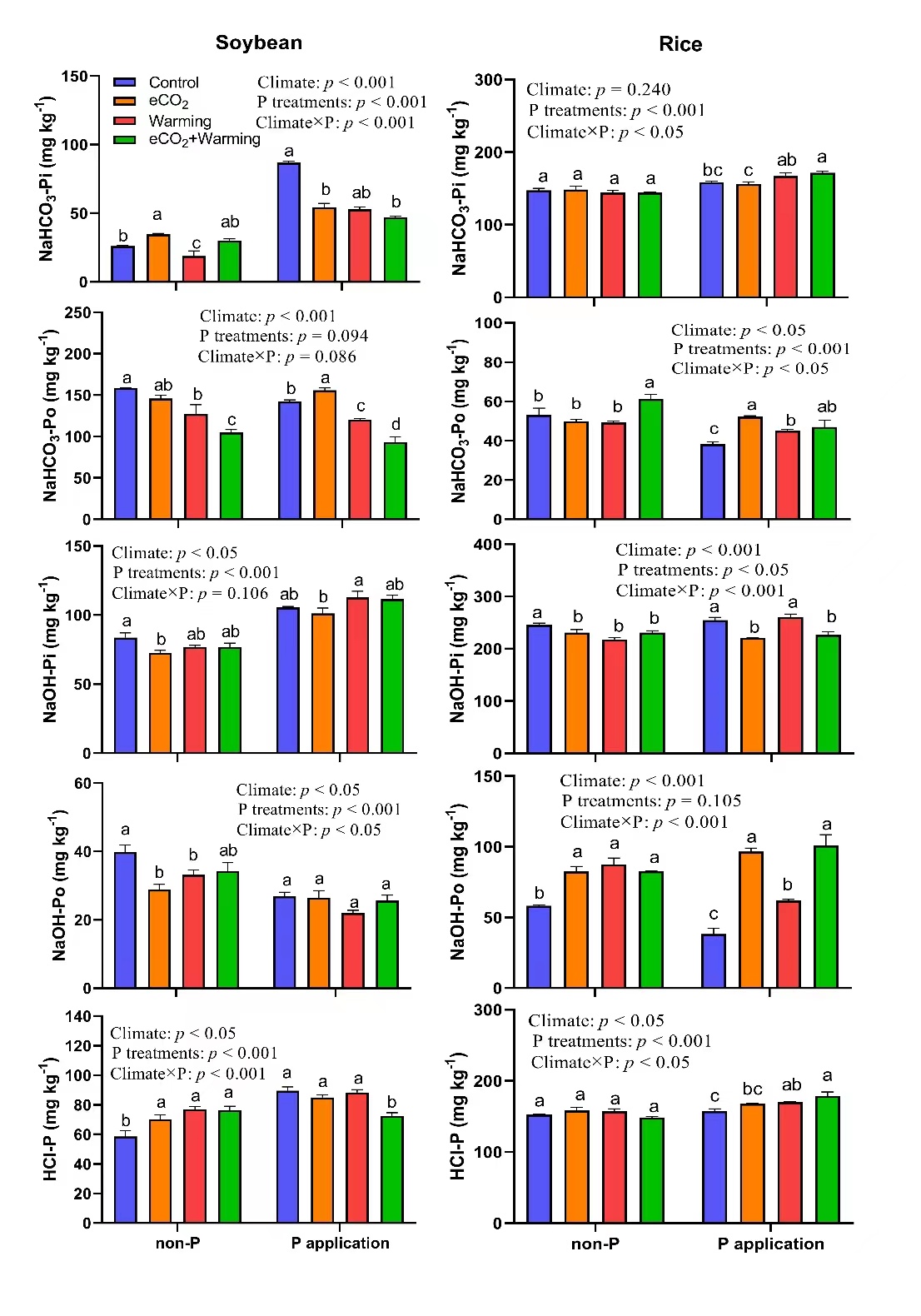 氣候變化深刻影響農(nóng)田生態(tài)系統(tǒng)養(yǎng)分循環(huán)。磷素(P)作為農(nóng)田生態(tài)系統(tǒng)中第二重要的植物營(yíng)養(yǎng)元素,能夠調(diào)節(jié)作物對(duì)氣候變化的適應(yīng)性。因此,研究作物磷吸收和土壤磷動(dòng)態(tài)對(duì)氣候變化下維持農(nóng)業(yè)生態(tài)系統(tǒng)可持續(xù)性至關(guān)重要。然而,大氣CO2濃度和溫度升高對(duì)作物生長(zhǎng)和土壤磷組分的影響,以及相關(guān)微生物機(jī)制鮮有研究。