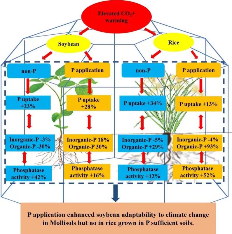 中國(guó)科學(xué)院東北地理與農(nóng)業(yè)生態(tài)研究所農(nóng)田分子生態(tài)學(xué)科組研究人員,利用開(kāi)頂式氣候室(OTC)模擬大氣CO2濃度和溫度升高,種植大豆和水稻在施磷肥和不施磷肥條件下作物磷吸收及根際土壤磷轉(zhuǎn)化相關(guān)微生物分子生態(tài)特征。研究發(fā)現(xiàn),在施磷肥和不施磷肥條件下,大氣CO2濃度和溫度升高分別增加大豆磷吸收23%和29%,水稻磷吸收34%和13%。因此,施磷條件下大豆磷吸收對(duì)氣候變化的響應(yīng)更為明顯,而水稻則是在不施磷條件下更為顯著。而且,大氣CO2濃度和溫度同時(shí)升高降低大豆根際土壤有機(jī)磷含量,卻增加水稻根際土壤有機(jī)磷含量(圖1)。大豆根際有機(jī)磷含量與酸性磷酸酶活性呈負(fù)相關(guān)關(guān)系,然而在水稻根際呈正相關(guān)關(guān)系。因此,氣候變化影響大豆根際土壤磷轉(zhuǎn)化以有機(jī)磷礦化為主,而水稻則以磷固定為主。此外,大氣CO2濃度和溫度同時(shí)升高增加了大豆施磷土壤磷轉(zhuǎn)化相關(guān)基因豐度,如phoD(堿性磷酸酶合成基因)、phoC(酸性磷酸酶合成基因)、pstS(磷酸鹽特異性轉(zhuǎn)運(yùn)蛋白酶)和phnX(磷酸酯酶基因),提出大豆根際有機(jī)磷的礦化是磷轉(zhuǎn)化的主要生物學(xué)過(guò)程,而水稻根際土土壤磷轉(zhuǎn)化主要以磷固定為主,而且根際土壤有效磷主要來(lái)自于無(wú)機(jī)磷的活化(圖2)。此研究揭示了作物—土壤—微生物系統(tǒng)磷循環(huán)的相關(guān)機(jī)理,為氣候變化條件下不同作物磷肥管理策略提供了理論基礎(chǔ)。