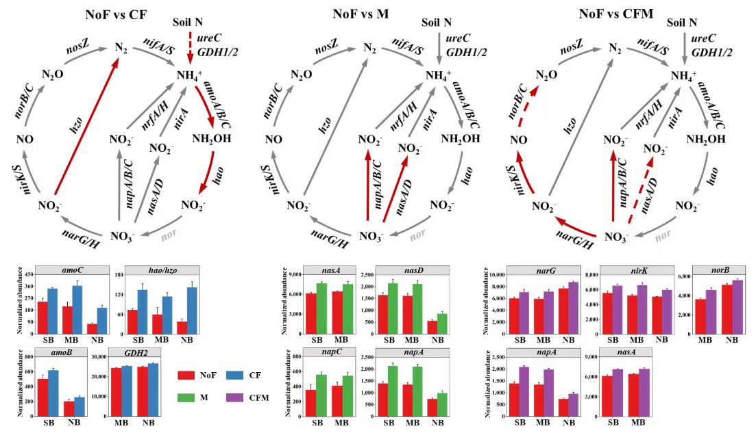 在此基礎上,團隊進一步利用高通量宏基因組測序技術,針對黑土農田碳氮循環(huán)功能基因進行分析。結果顯示,單施有機肥或與化肥配施顯著改變黑土碳氮功能基因的群落結構,增加了纖維素和果膠降解的涉碳基因豐度;而長期單施化肥顯著積累了黑土氨氧化作用相關功能基因豐度,可能導致硝酸鹽富集淋失及N2O排放增加(圖1);同時發(fā)現(xiàn)長期有機肥添加顯著富集同化和異化硝酸鹽還原作用相關功能基因,這有助于提升黑土銨態(tài)氮含量及氮肥利用率(圖2);然而,有機肥化肥配施會進一步導致黑土反硝化作用相關功能基因豐度的顯著增加,表明過量氮素養(yǎng)分投入可造成土壤氮素通過氣態(tài)形式損失的風險(圖2)。該研究為推進黑土區(qū)化肥減量化,構建有機肥施用長效機制提供微生物學理論依據。