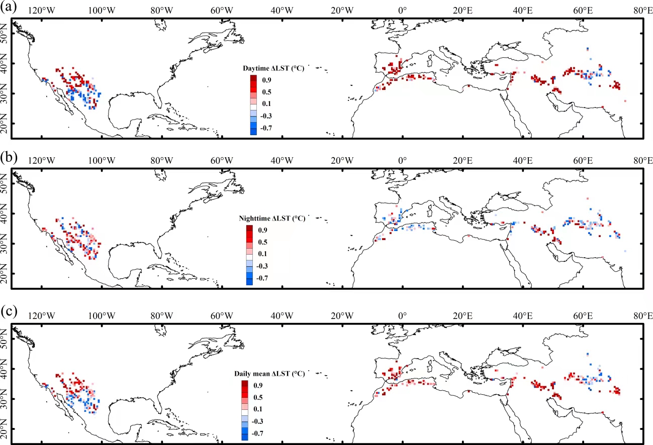 氣候變化和人類活動影響下,全球許多地區尤其北半球溫帶干旱半干旱地區,草原生態系統正普遍發生灌木入侵即“草原灌叢化”現象。草原灌叢化不僅影響草原生態系統植被組成,還可能通過影響生物地球化學和物理過程對區域氣候產生一定影響。在過去幾十年,盡管草原灌叢化已成為北半球溫帶半干旱地區草原面臨的一大生態問題,但草原灌叢化對該地區氣候可能帶來怎樣影響尚不明確。基于衛星獲取的土地利用/覆被數據、陸地表面溫度、地表反照率、蒸散發、葉面積指數等數據,東北地理所濕地生態系統管理學科組定量分析了北半球溫帶半干旱地區草原灌叢化對區域地表溫度的影響。