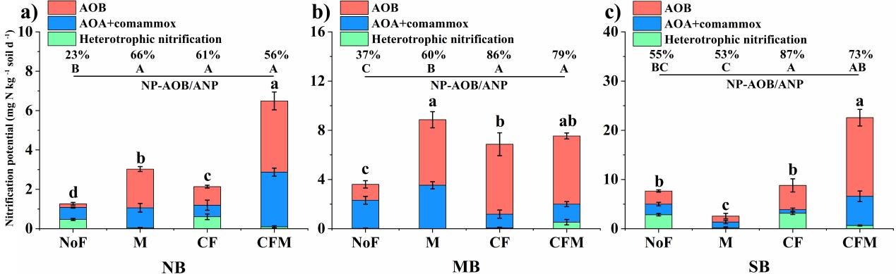 土壤氨氧化也稱為硝化,分為自養和異養兩個過程。自養微生物的氨氧化細菌(AOB)、氨氧化古菌(AOA)和全程氨氧化細菌(Comammox)共同驅動土壤銨態氮向硝態氮轉化,但三類氨氧化微生物的相對貢獻因土壤環境變化存在較大差異。東北黑土農田土壤氮素含量相對較高,但氮肥的利用效率不高,為控制銨態氮向硝態氮轉化及提高肥料利用率,解析氨氧化微生物介導的黑土農田硝化作用具有重要的實踐意義。為此,東北地理所的科研人員聯合黑龍江省農科院土肥所、黑河分院及吉林省農科院研究團隊,利用位于黑河(NB)、民主鄉(MB)和公主嶺(SB)的三個30余年的黑土野外定位施肥平臺,研究了長期化肥與有機肥不同施用方式下的土壤氨氧化微生物豐度、活性和相對硝化貢獻的變化情況。