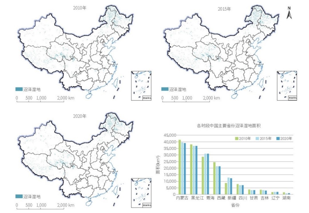 2010 年、2015 年和2020 年中國沼澤濕地空間分布