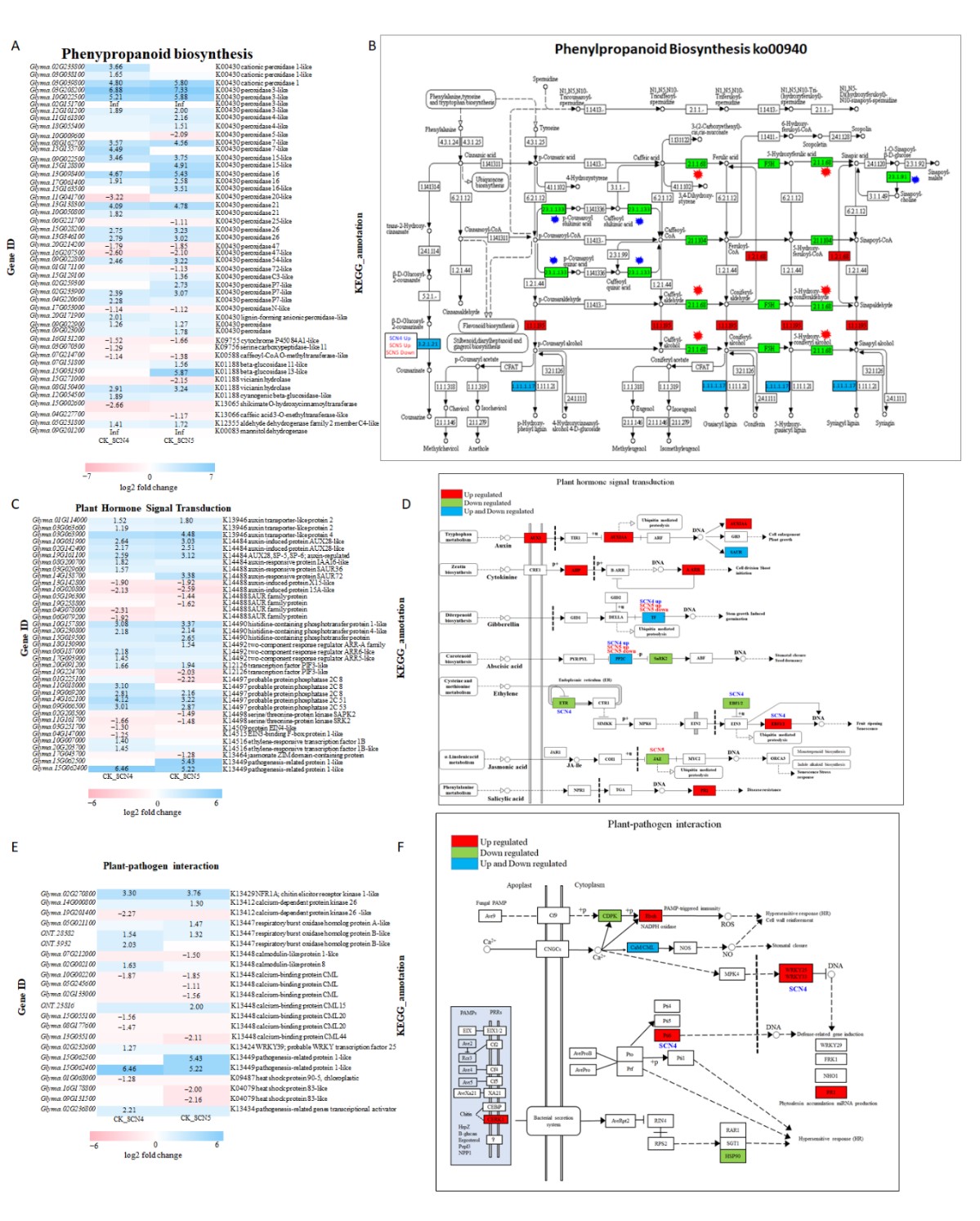 三代全長轉(zhuǎn)錄組測序技術(shù)相比二代測序技術(shù),無需打斷,可直接讀取全長RNA分子全長序列,準確辨別二代測序技術(shù)無法準確識別的如可變剪接(AS)、可變多聚腺苷酸化(APA)、融合基因、長鏈非編碼RNA(lncRNA)等結(jié)構(gòu),且可同時對基因和轉(zhuǎn)錄本進行定量分析等優(yōu)點。通過對接種8天的大豆種質(zhì)09-138進行全長轉(zhuǎn)錄組測序及分析,共獲得6.1 GB的clean data和65,038個轉(zhuǎn)錄本序列;轉(zhuǎn)錄本去冗余后鑒定得到1117個新基因和41,096個新轉(zhuǎn)錄本;進而對新轉(zhuǎn)錄本的序列結(jié)構(gòu)進行分析,發(fā)現(xiàn)不親和抗性反應(yīng)比親和性反應(yīng)產(chǎn)生更多>10-PolyA位點(APA)和更多得融合基因,lncRNA和防御反應(yīng)有關(guān)的轉(zhuǎn)錄因子相關(guān)聯(lián),AS的3’和5’剪接位點數(shù)量接種后都發(fā)生變化,說明這些結(jié)構(gòu)變異參與了線蟲的抗感反應(yīng)。差異表達基因(DEGs)的GO(Gene Oncology)和代謝通路KEGG(Kyoto Encyclopedia of Genes and Genomes)分析結(jié)果顯示抗感線蟲侵染后富集于生長激素、生長素激活信號通路和多維細胞生長通路以及苯丙烷生物合成通路(圖1);在非親和反應(yīng)中發(fā)現(xiàn)更多的與應(yīng)激反應(yīng)元件(圖2)、植物激素信號轉(zhuǎn)導(dǎo)途徑和植物-病原菌互作途徑相關(guān)的DEGs上調(diào)表達(圖1),而在親和性反應(yīng)中檢測到更多與細胞壁修飾和碳水化合物生物過程相關(guān)的上調(diào)基因表達;結(jié)合DEGs的蛋白質(zhì)-蛋白質(zhì)互作分析首次發(fā)現(xiàn)線蟲侵染大豆根部后只有不親和反應(yīng)激起激酶MAPK/KK/KKK、轉(zhuǎn)錄因子WRKY和鈣調(diào)蛋白VQ之間互作參與抗性防御調(diào)控(模型如圖3)。本研究中獲得的AS、APA和lncRNA為植物-線蟲相互作用過程中轉(zhuǎn)錄后修飾的功能研究提供理論基礎(chǔ),且大豆與大豆孢囊線蟲間親和性和非親和性互作的分子機制將有助于解析其他植物與線蟲互作的分子機理,進一步的功能研究將有助于探索線蟲防治的新策略。