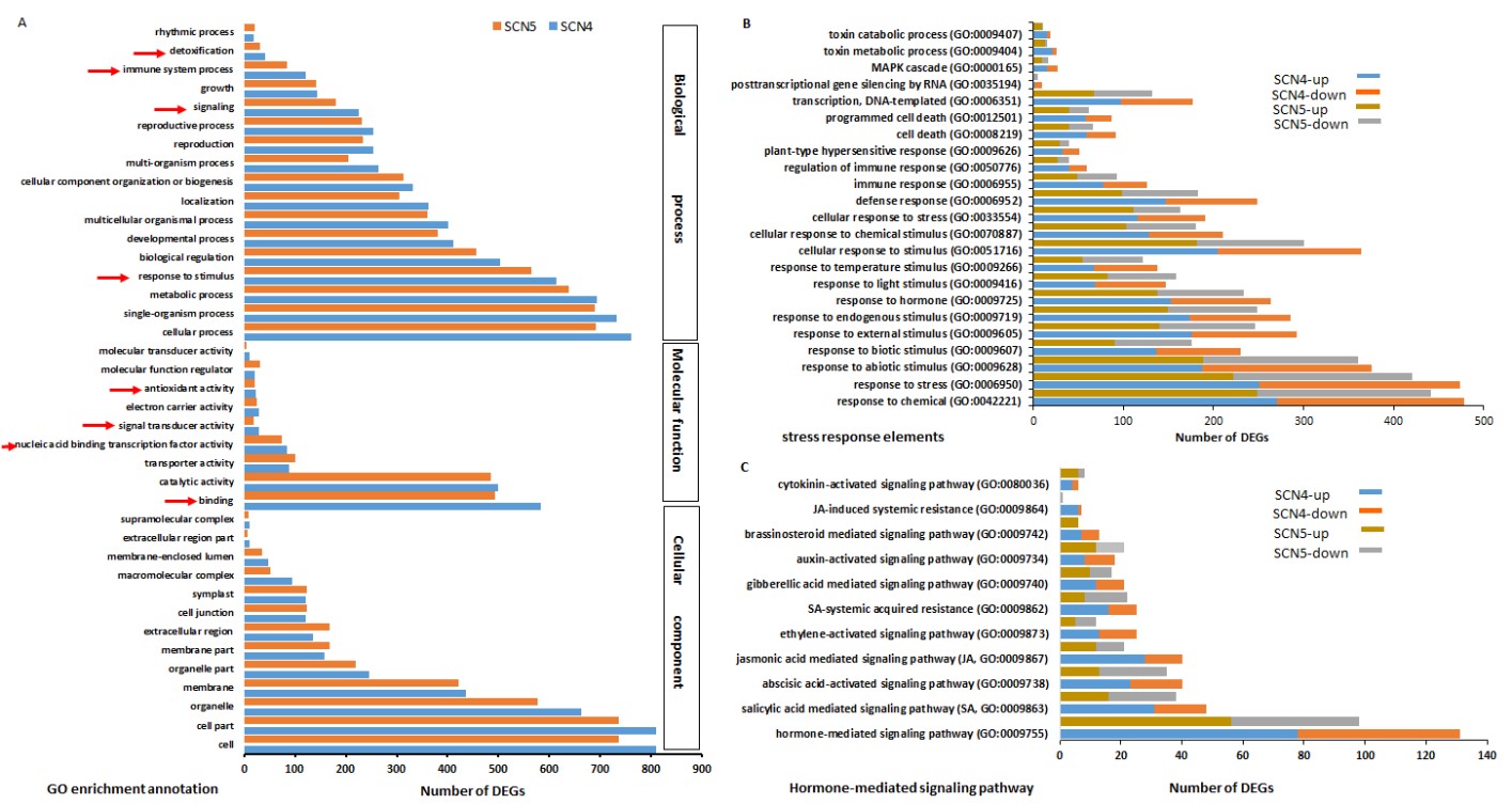 大豆孢囊線蟲病(SCN,Heterodera glycines)是制約大豆生產(chǎn)的全球毀滅性病害之一。大豆抗病品種應(yīng)用是防治大豆孢囊線蟲病最經(jīng)濟有效的方法,然而大豆對大豆孢囊線蟲的抗性是由多基因控制并具有數(shù)量性狀的特性,但抗性背景單一,線蟲生理小種易發(fā)生變異,因此亟需開發(fā)多抗基因資源和培育多抗品種。農(nóng)田有害生物控制學(xué)科組王從麗研究員團隊在前期研究過程中篩選到一個新的大豆抗線蟲育種基因型09-138(rhg1a + Rhg4b),對毒性強的生理小種(SCN4)具有抗性,但對毒性弱的生理小種(SCN5)感病(Huang等,2022,Nematology),為了充分利用該抗性資源,了解其抗性機制,該團隊首次在大豆上利用三代全長轉(zhuǎn)錄組測序技術(shù)(Oxford Nanopore Technology, ONT)開展了該大豆種質(zhì)對孢囊線蟲親和性(感病)和非親和性(抗病)反應(yīng)的調(diào)控機理研究。