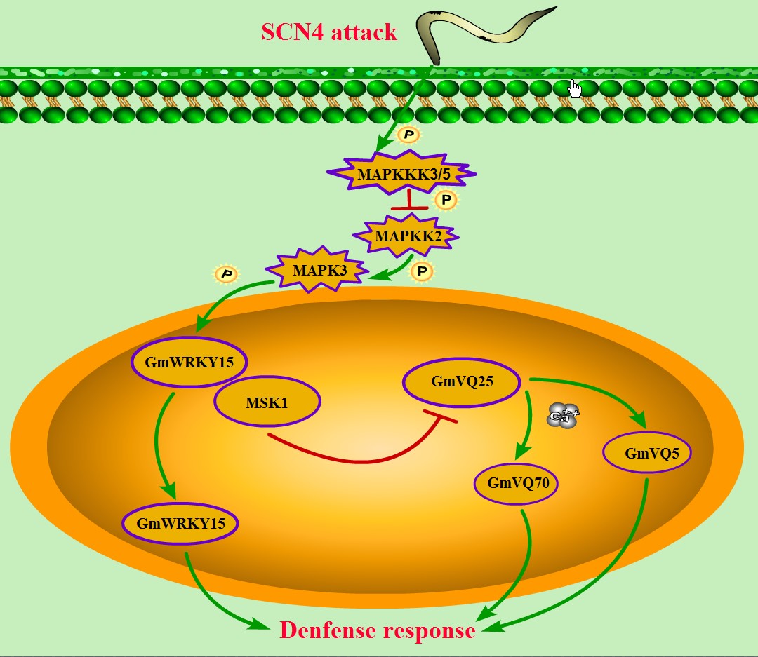 圖3 大豆孢囊線蟲侵染大豆不親和反應(yīng)激起MAPK-WRKY-VQ互作防御反應(yīng)