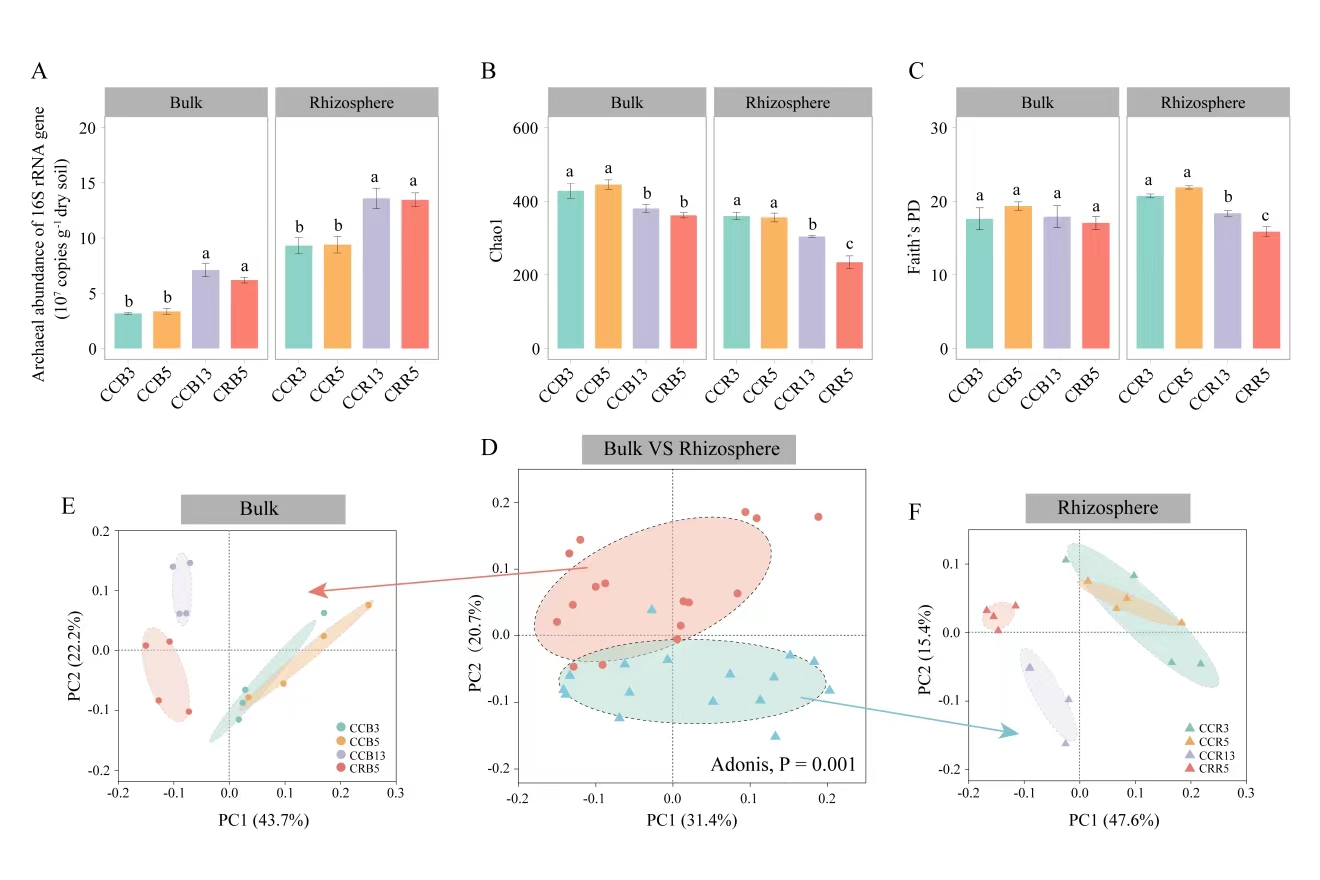 為此,東北地理所農(nóng)田分子生態(tài)學(xué)科組科研人員基于大豆短期連作(3年和5年)、長期連作(13年)及大豆-玉米輪作處理,采用高通量測序技術(shù)系統(tǒng)研究了根際和非根際土壤古菌群落的豐度、多樣性和組成特征,結(jié)合細(xì)菌和真菌群落對微生物網(wǎng)絡(luò)結(jié)構(gòu)和微生物抗性進(jìn)行綜合分析,以闡明連作下土壤微生物群落變化與作物產(chǎn)量間的互作關(guān)系。