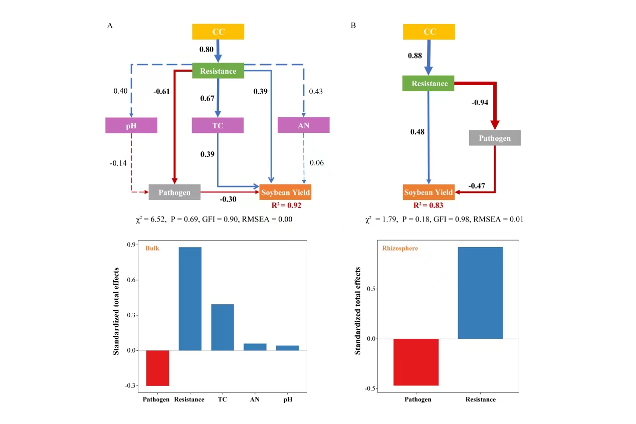 圖2土壤微生物抗性指數(shù)對土壤養(yǎng)分、潛在植物病原菌豐度和大豆產(chǎn)量的影響