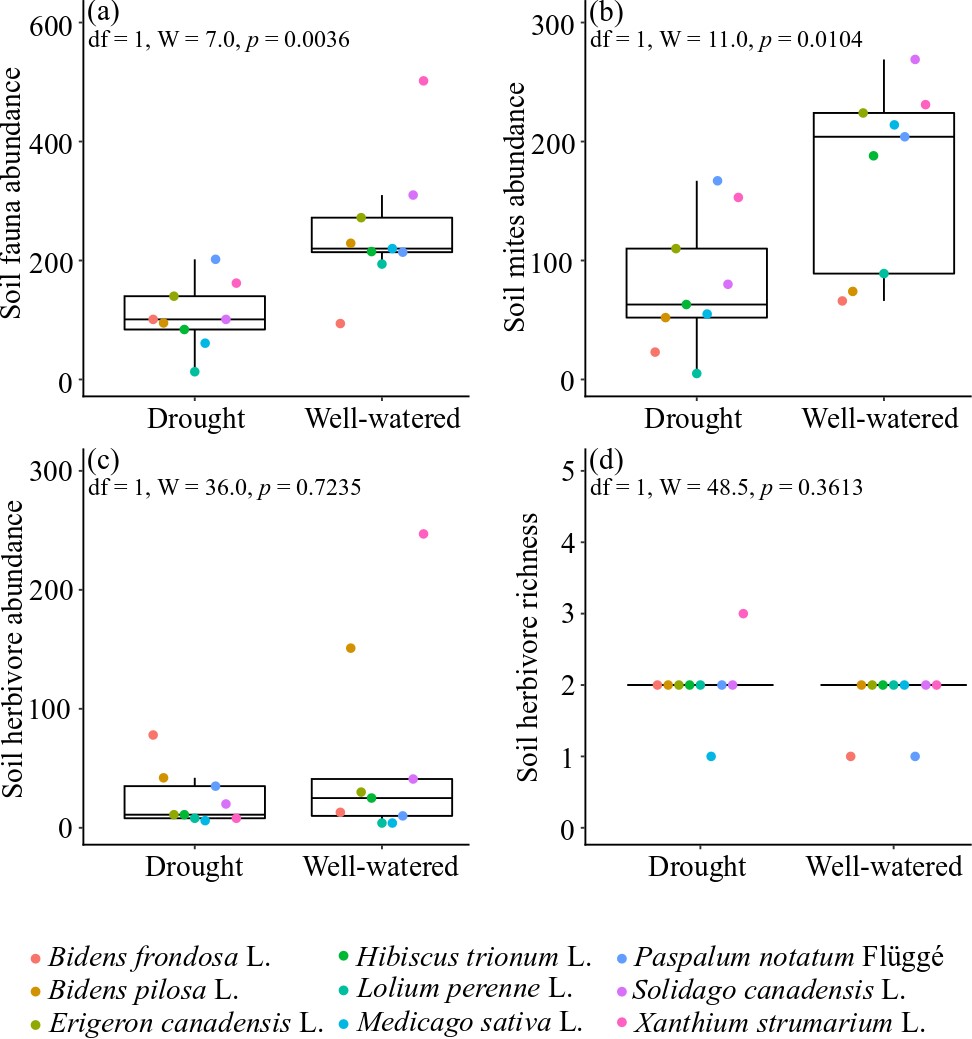 作為生態系統的重要限制性環境因子,土壤養分和水分變化可能會影響植物入侵過程。與養分富集促進外來植物入侵的普遍共識不同,干旱對外來植物入侵影響的研究相對缺乏、且研究發現存在分歧。原因之一可能是部分控制實驗只考慮了干旱對外來植物入侵直接效應,并未考慮外來/本地植物與其他生物類群的互作過程。已有研究證實中型土壤動物會影響植物之間的競爭、且對土壤水分變化的響應敏感。因此,理論上中型土壤動物存在與否會影響干旱情景下的植物入侵過程。但是,目前對該問題尚缺乏明確的實驗論證。
