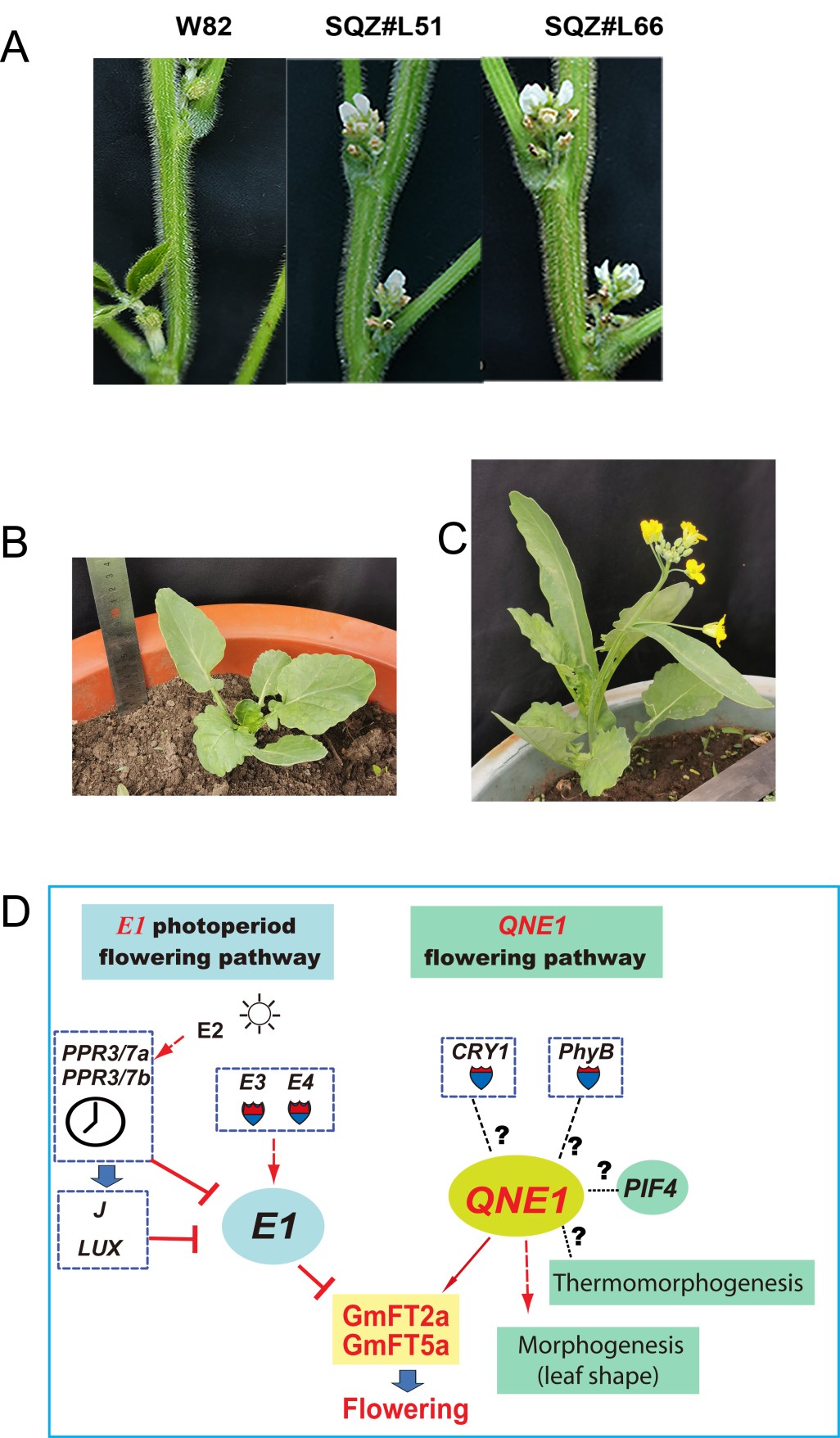 A:過表達(dá)Qne1大豆呈早花表型。W82:野生型Williams 82品種; SQZ#L51與SQZ#L66, 為過表達(dá)Qne1 植株。 B-C, 過表達(dá)Qne1油菜促進(jìn)開花與引致葉形態(tài)變化。B:野生型油菜品種K407, C:過表達(dá)Qne1油菜植株。D:Qne1功能的模型圖。 與日照時(shí)長密切相關(guān)的E1光周期開花通路相比,Qne1通路調(diào)控植物開花不受光周期所調(diào)控。同時(shí)Qne1 還調(diào)控植物葉片形態(tài)。