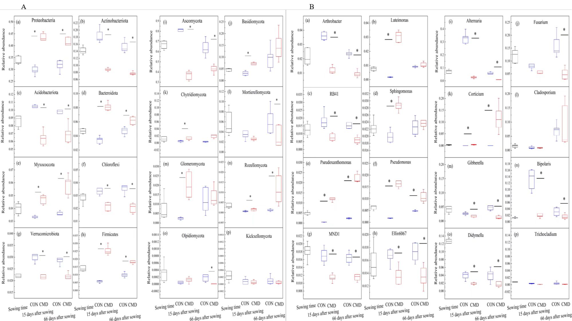 圖1牛糞沉積過(guò)程中燕麥根際微生物門(mén)水平(A)和屬水平(B)細(xì)菌的相對(duì)豐度