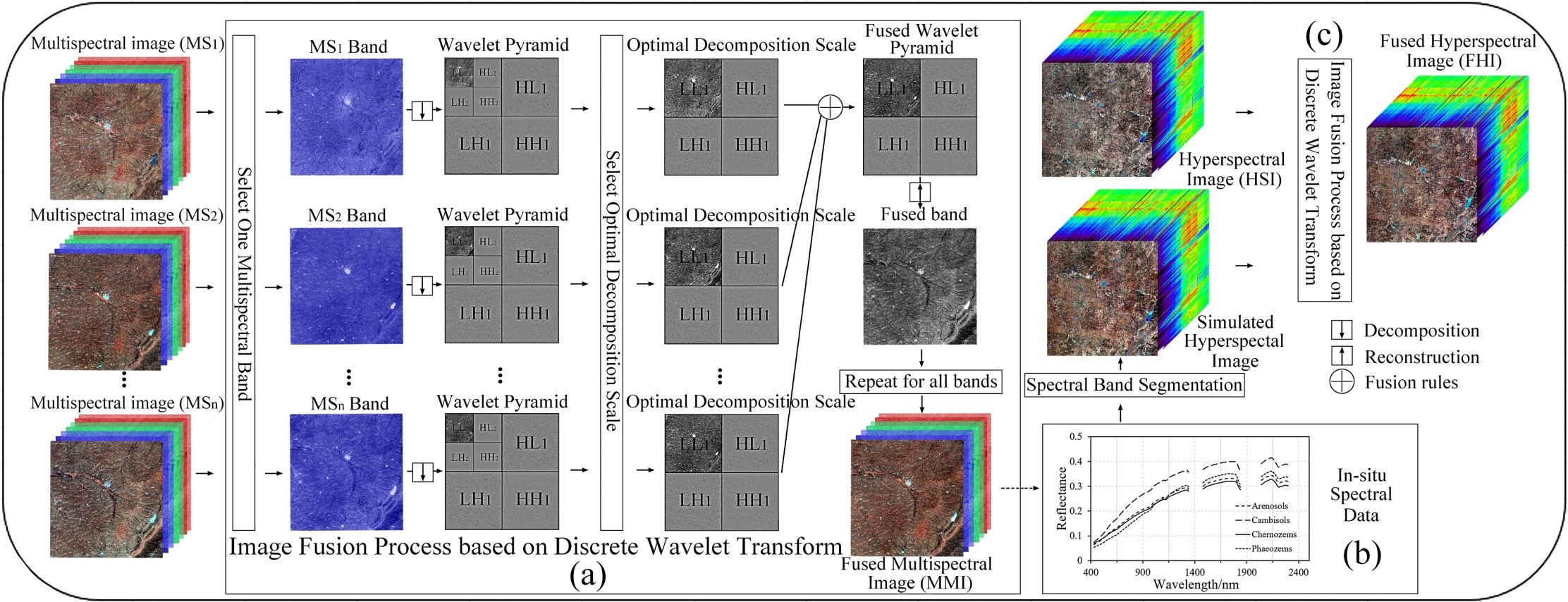 在全球碳循環中,土壤有機碳(SOC)是最大的陸地碳庫,約占陸地總碳的50-80%,其含量是大氣或植被的三倍以上,并決定了景觀的碳源、碳匯能力。了解土壤有機碳含量對環境可持續性和碳中和至關重要。隨著遙感數據和預測模型的發展,融合多源遙感數據預測SOC含量是一個有趣而富有挑戰性的課題。為此,中國科學院東北地理與農業生態研究所農業遙感學科組的科研人員基于區域能量權重的離散小波變換和譜帶分割方法,融合了2009-2019年10個場景的陸地衛星多光譜圖像數據的時相信息、地形數據的空間信息和高分5號高光譜圖像的光譜信息。然后,利用偏最小二乘回歸、隨機森林和卷積神經網絡算法,開發一種提取時-空-譜(TSS)融合信息的新方法,驗證TSS信息是否能夠更好地代表土壤信息,提高土壤有機碳含量預測的準確性,并驗證模型的可移植性,評估時相、空間和光譜信息在預測SOC含量中的作用。