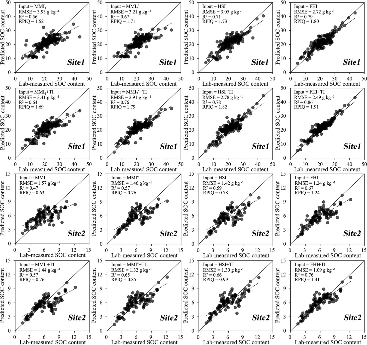 圖3基于不同輸入量的實驗室實測與預測SOC含量之間的散點圖