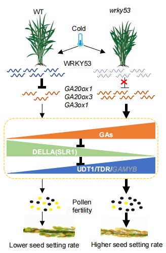 該研究揭示了OsWRKY53轉(zhuǎn)錄抑制GA生物合成基因來調(diào)控花藥中GA含量,從而負(fù)調(diào)控水稻孕穗期耐冷性;GA通過解除OsSLR1對OsUDT1/OsTDR的抑制,來調(diào)控水稻育性;不同優(yōu)良品種背景下oswrky53水稻材料孕穗期耐冷性顯著提高,且低溫脅迫條件下oswrky53突變體植株產(chǎn)量顯著高于對照。該研究為水稻孕穗期耐冷分子育種提供有價值的位點。