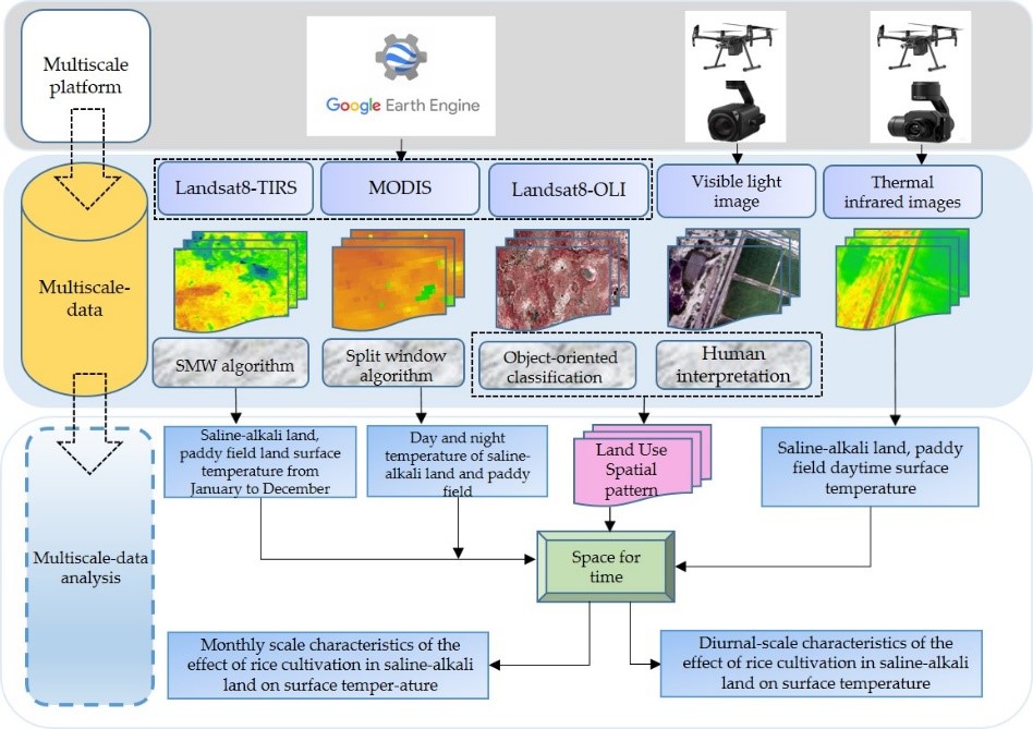 因此,本研究以吉林省西部大安市為研究區(qū),利用1km MODIS產(chǎn)品、30m Landsat 8衛(wèi)星圖像和厘米級(jí)無(wú)人機(jī)圖像,獲得了鹽堿地和水田地表溫度的多尺度數(shù)據(jù),分析了鹽堿地和水田在一年中不同月份和一天中不同時(shí)間的地表溫度變化特征。并采用“空間代時(shí)間”的方法評(píng)估了鹽堿地種稻對(duì)局地地表溫度的影響。基于衛(wèi)星觀測(cè)的結(jié)果表明,在作物生長(zhǎng)季,鹽堿地地表溫度顯著高于稻田,尤其是在生長(zhǎng)季中期的7月和8月;鹽堿地種稻的降溫效應(yīng)主要集中在白天而非夜晚;基于無(wú)人機(jī)熱紅外觀測(cè)結(jié)果進(jìn)一步證實(shí)了這一結(jié)論。