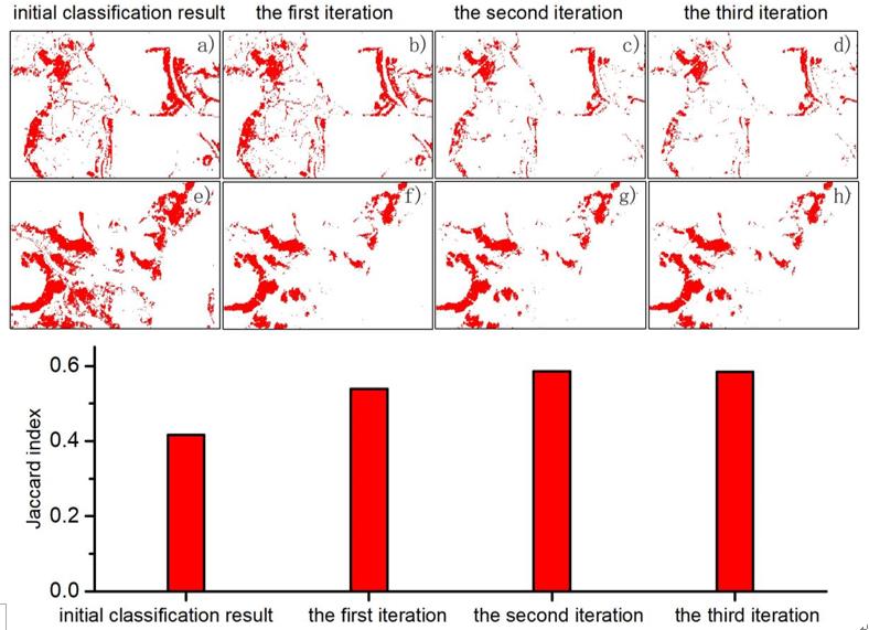 針對上述問題,東北地理所地理景觀遙感學科組研究人員受二分類算法機理啟發,在正樣本固定的前提下,通過迭代優化負樣本不斷改進決策面,提出了一種決策面優化方法。這一方法能夠在不引入新的正樣本情況下,通過迭代方式獲取新的誤分類樣本,從而壓制誤分類斑塊、減輕樣本獲取壓力,首次完成了中國國家尺度外來紅樹植物無瓣海桑遙感提取。