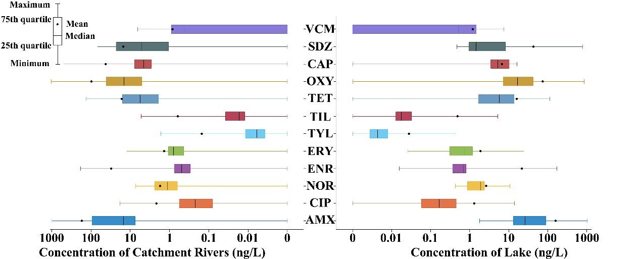 圖3. 12種抗生素在湖泊和周邊匯水區離散性分布