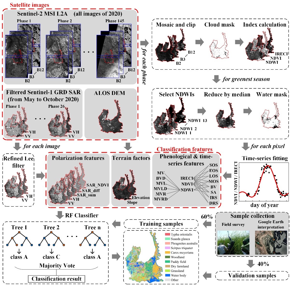 濕地是最具生物多樣性的生態(tài)系統(tǒng)。植物群落是濕地的基本單元,也是濕地能夠提供諸多生態(tài)系統(tǒng)功能與服務(wù)和保護(hù)生物多樣性等的重要基礎(chǔ)。因此,準(zhǔn)確的植物群落空間分布信息對于濕地的健康評估和可持續(xù)生境管理至關(guān)重要。然而,受濕地環(huán)境的動態(tài)性和復(fù)雜性、濕地植物光譜的相似性以及遙感影像云(陰影)噪聲像素等因素的限制,實現(xiàn)基于遙感技術(shù)的濕地植物群落精細(xì)分類十分困難,這已成為影響濕地精細(xì)管理的制約因素之一。因此,迫切需要開發(fā)有效的濕地植物群落分類方法。