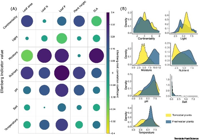 (2)水生植物的功能性狀可以用來指示其所在生態系統特征。以Ellenberg指數為例,不同水生植物功能性狀對其生境的大陸性、光照、濕潤度、營養、pH值、鹽度、溫度等指標具有相應的指示作用(圖2A),并展示出與其他陸生植物不同的格局和趨勢(圖2B)。